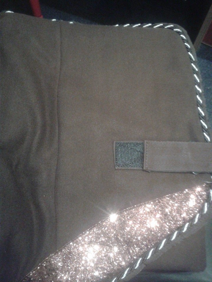 Zeer mooie fleece statiedeken met afneembare kruisingels, ornament aan de achterzijde en een borstflap aan de voorzijde. Aan de hals en achterzijde is de deken afgezet met 2 rijen strass.