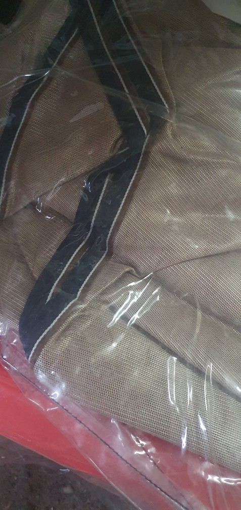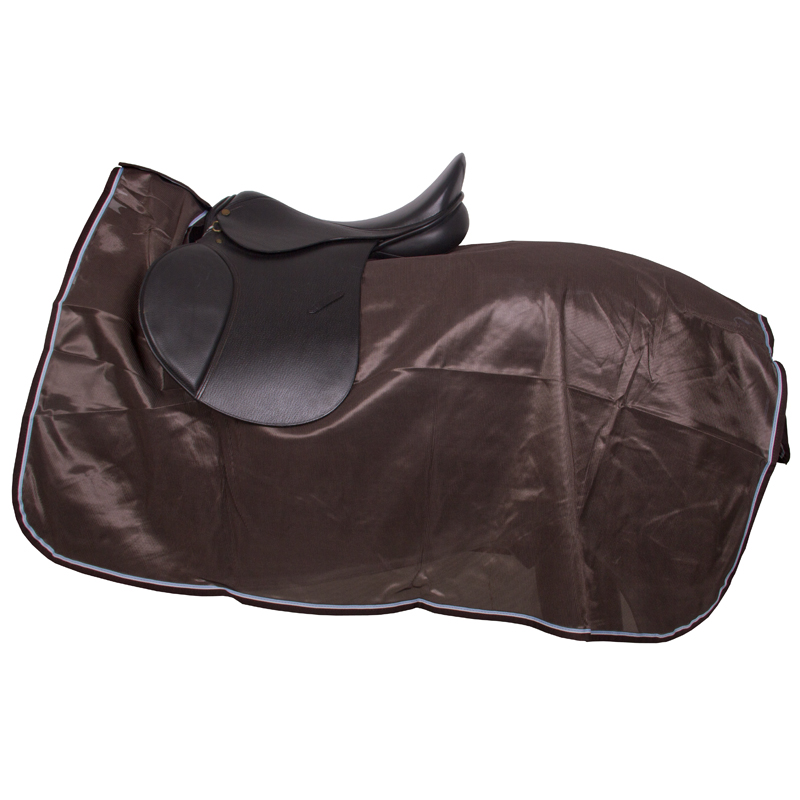 Anti vliegen uitrijdeken met klittenbandsluiting op schoft, met zadeluitsparing en staartflap. 100% polyester.