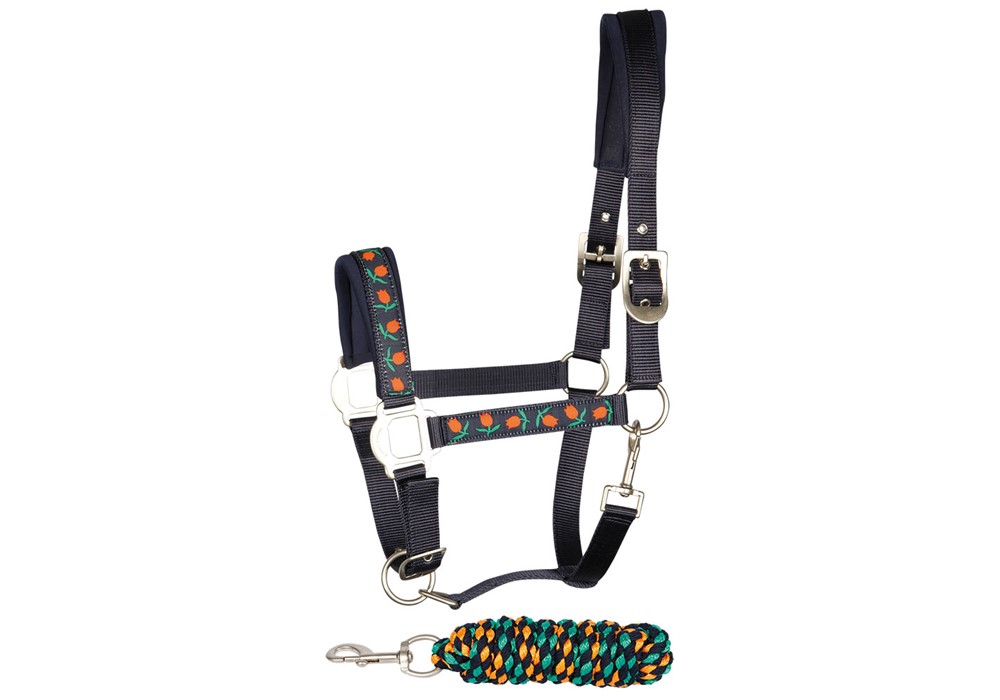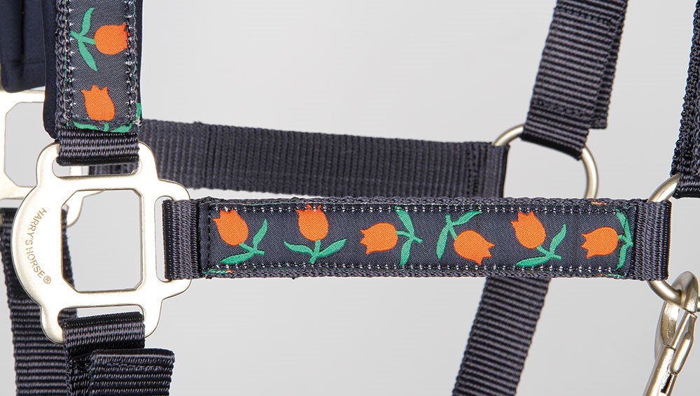 Halster met oernederlands tulpen thema op de neusband en bakstukken, neopreen onderlegd, satin finish buckles met HH laserprint logo. Aan twee kanten verstelbaar op het kopstuk en verstelbaar onder de kin. Inclusief bijpassend halstertouw.