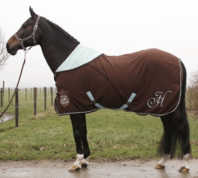 Deken van soft shell materiaal met trendy badge aan de punt. Dubbele borstsluiting en nylon borstvoering tegen schuren. Kruissingels met elastische inzet, afneembare elastische bilkoorden en staartflap. Zware softnylon afbiezing. Geschikt als zweet en tussendoor deken
