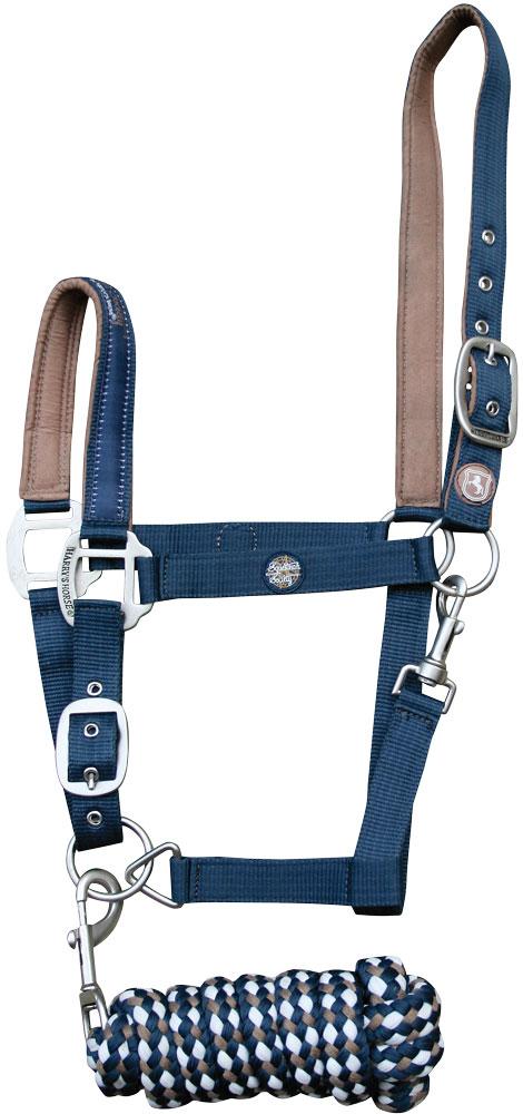 PP halsterset met satin finish fournituren en domy suede padding. Incl. 2M-touw met muskaton. Verstelbaar aan het kopstuk en onder de kin.