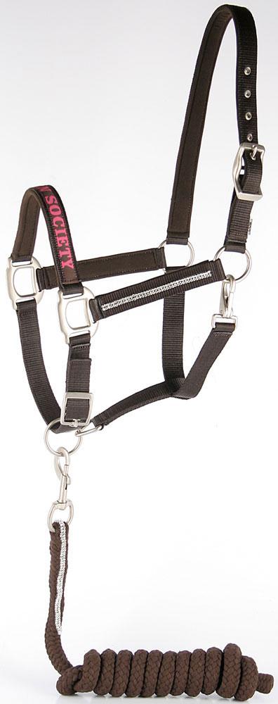 PP halsterset met matte, zilveren fournituren en domy suede padding. Met chique woven ribbon op de neusriem. Zowel de bakstukken als het touw is uitgerust met luxe transparante kristallen. Verstelbaar aan het kopstuk (dubbel) en onder de kin.