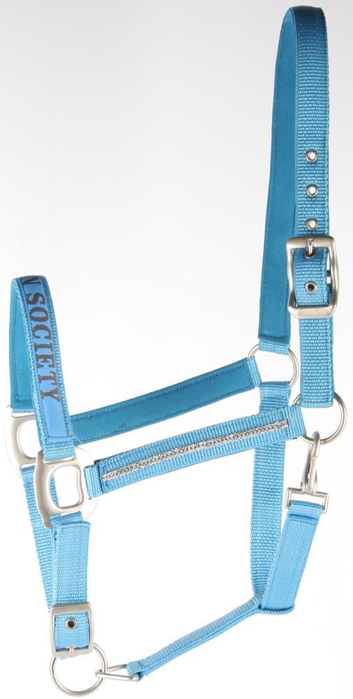 PP halsterset met matte, zilveren fournituren en domy suede padding. Met chique woven ribbon op de neusriem. Zowel de bakstukken als het touw is uitgerust met luxe transparante kristallen. Verstelbaar aan het kopstuk (dubbel) en onder de kin.