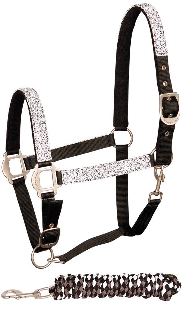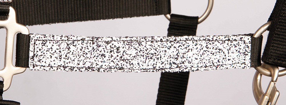 Halsterset met gave glitter op de PP basis, onderlegd met towellook fleece. Verstelbaar op het kopstuk en de kaak. Clipsluiting aan de kaak. De gaatjes zijn voorzien van metalen ringen. Inclusief luxe 2m touw