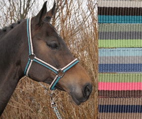 Harry's Horse® Halsterset 'Mercurius'. Vrolijk gestreept nylon halster, ruim verstelbaar aan neusriem en kopstuk, clipsluiting aan de kaak. Neusriem en kopstuk zacht onderlegd met domy suède. Compleet met bijpassend halstertouw met musketonsluiting.