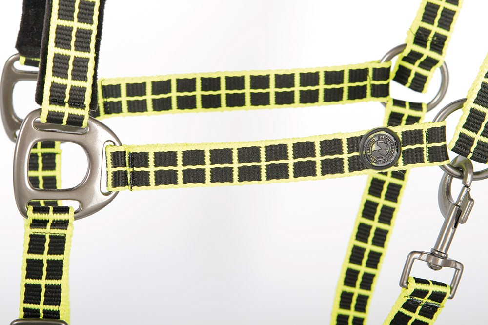 Zwart halster met vrolijk gekleurd blok patroon in neon kleuren.
