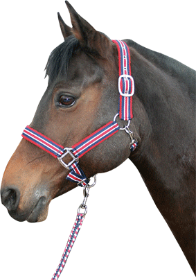 Harry's Horse Red Pierrot halsterset. Vrolijk gestreept nylon halster, ruim verstelbaar aan neusriem en kopstuk, clipsluiting aan de kaak. Neusriem en kopstuk zacht gevoerd met fleece. Compleet met bijpassend halstertouw met musketonsluiting