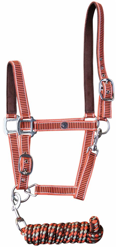 Halster met bijpassend halstertouw. Verstelbaar bij het kopstuk en de neusriem door middel van een gesp. Met clip-sluiting bij de keelriem. Het kopstuk en de neusriem zijn gevoerd met fleece. Inclusief bijpassend halstertouw met musketon.