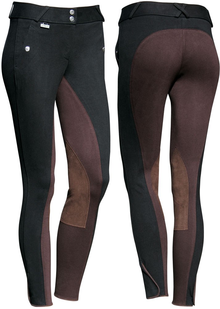 Rijbroek met lagere, brede tailleband, steekzakken met drukknoop sluiting, dubbele schuifgesp sluiting en rits, riemlussen, kunstleder kniestukken en klittenband sluiting aan de onderkant van de broekspijp.