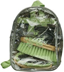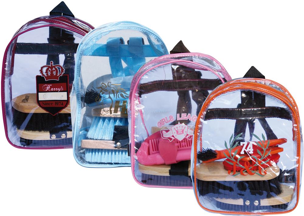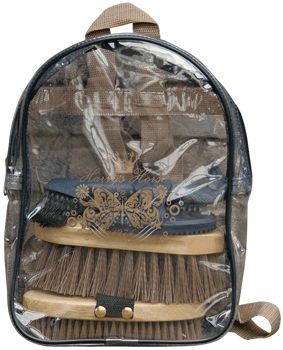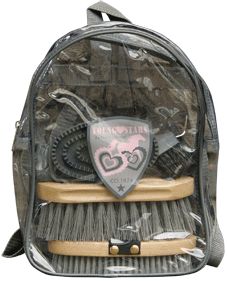 Leuk rugtasje met poetsset, bestaand uit rosborstel, harde borstel, glansborstel, manenkam en hoevenkrabber.