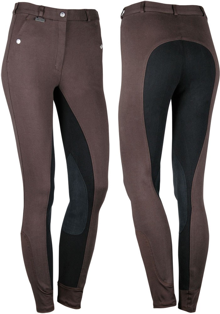 Rijbroek met steekzakken met drukknoopsluiting, schuifgesp sluiting en rits, riemlussen, elastische kunstlederen kniestukken en lycra inzet onderaan de broekspijp.