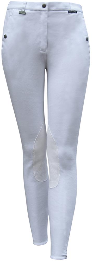 Rijbroek van gebreid katoen met 5% elasthan, hierdoor is het draagcomfort zeer aangenaam. De rijbroek zit als een tweede huid, door het zachte materiaal wordt schuren voorkomen. Voorzien van hoge band met riemlussen, steekzakken met drukknoop, rond genaaid zitvlak, kunstlederen kniestukken voor extra grip en klittenbandsluiting aan de enkel.