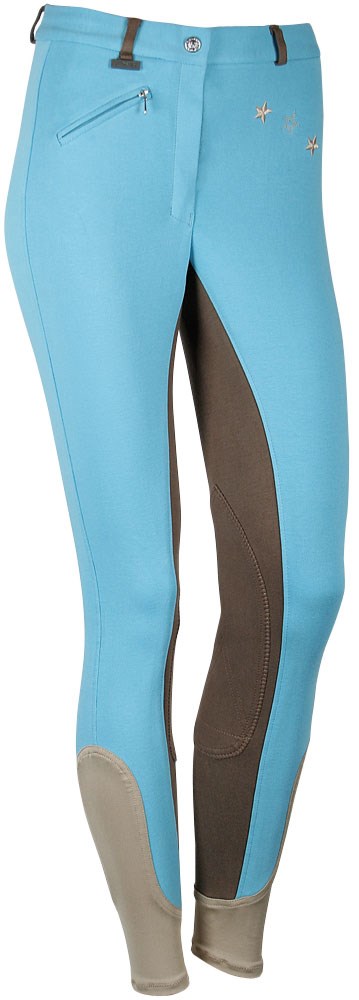 Rijbroek met schuifgesp en ritssluiting, riemlussen, kunstleder kniestukken, elastische inzet onderzijde pijpen, borduursel