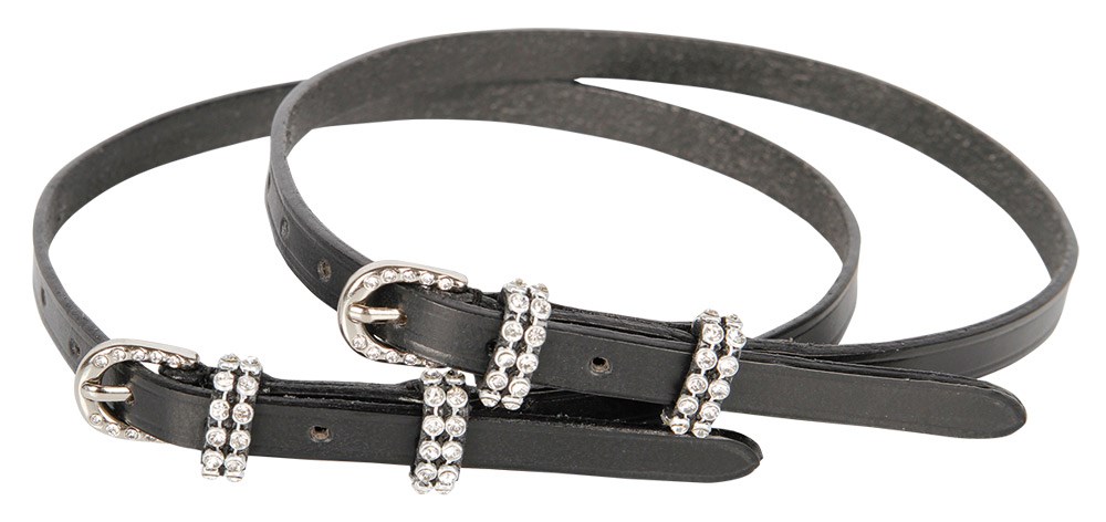 Lederen spoorriemen met gespsluiting. Voorzien van doorzichtige crystallen op de gesp en op de passanten.