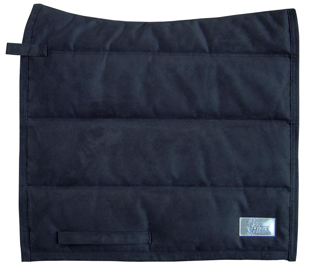 Universele pad van synthetisch suede met vochtregulerende voering. In horizontale banen dubbel doorgestikt op 12cm. Vulling bestaat uit high density foam en polyfill. Lussen voorzien van klittenband ter bevestiging aan het zadel.