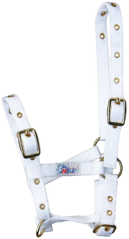 Dit veulenhalster is op drie punten verstelbaar, daardoor bruikbaar van veulen tot jaarling. Goudkleurige fournituren, gaatjes voorzien van ringen.