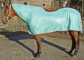Vliegendeken met hals en zadeluitsparing. Voorzien van borstsluitingen, bilkoorden. valt een maat ruimer