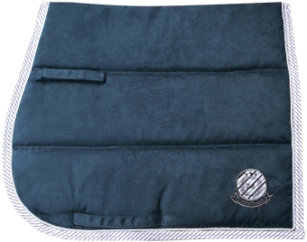 Zadeldek van luxe suedine buitenstof, vochtregulerende binnenvoering, in 4 banen doorgestikt. Sierkoord en buitenbies in navy/cream.