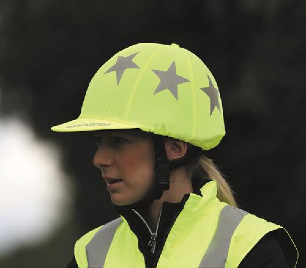 Ideaal om op te vallen in het donker! Met de equi-FLECTOR® hat cover val je op in omstandigheden met weinig licht of bij het rijden op de weg. Felgekleurde met reflecterende sterren. One size fits 53 - 62cm cover