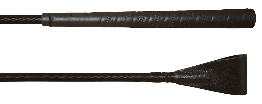 Luxe springzweep met rubberen golfclub handvat, fijn gevlochten stok en een zwart lederen flapper (dicht).